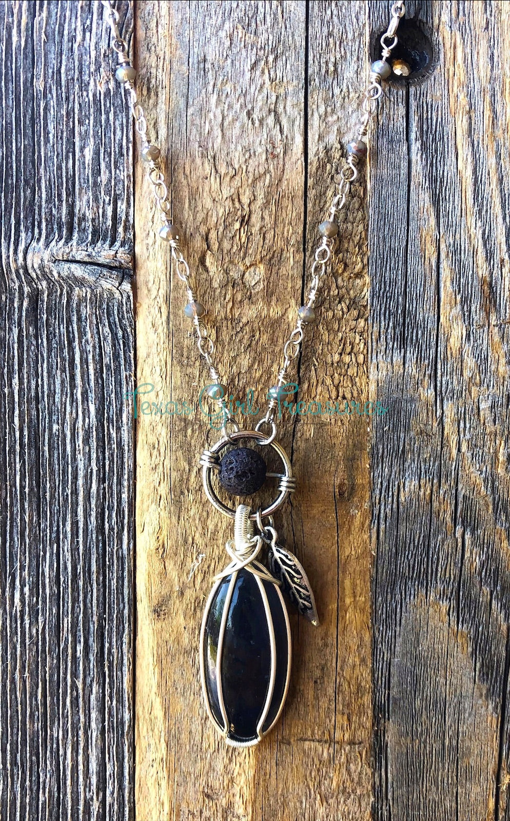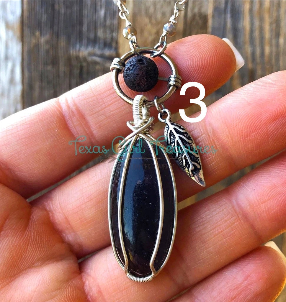 Diffuser bead is located just above the wire wrapped pendant. Apply a drop or two of your favorite essential oil on the bead and it will diffuse for 8-10 hours. Once the smell dissipates, reapply the same scent or choose a different one.