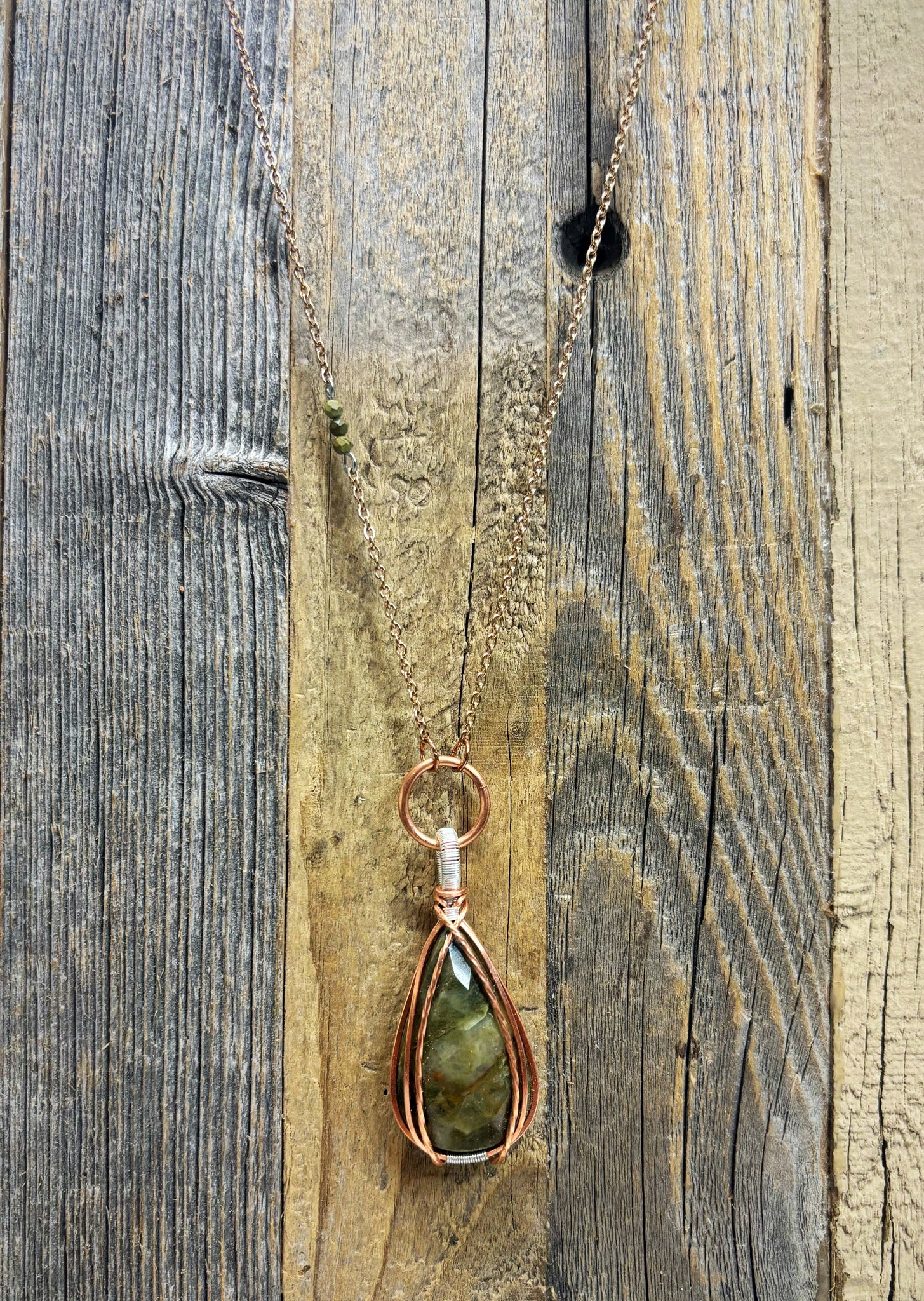 Rainforest Jasper - Copper with silver accents. Accent beads on rose gold stainless steel chain. Meaning: Joyful, grounding, stops procrastination
