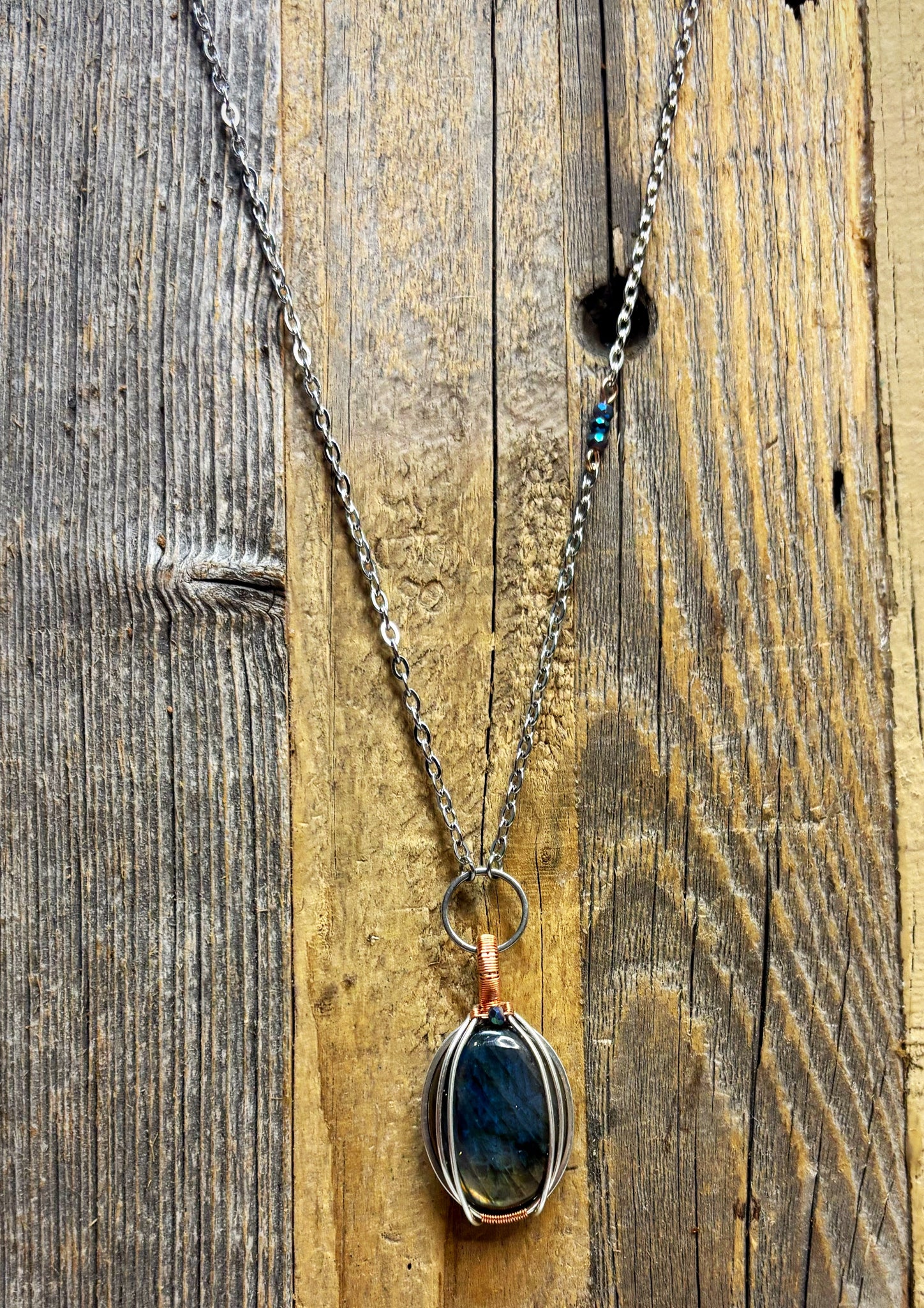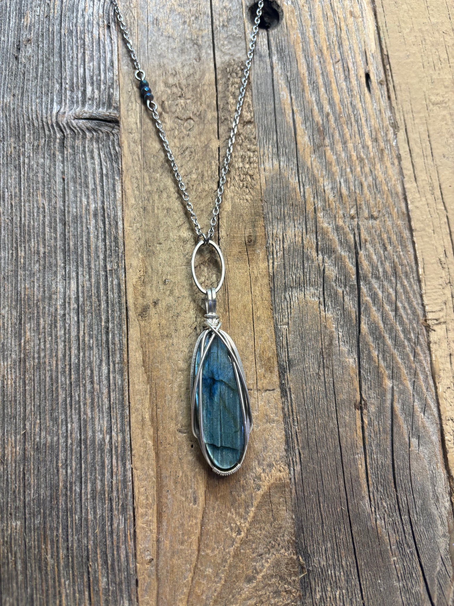 Beautiful Blue/green oval Labradorite on an 18” chain with a 2”-3” extender on the back. Accent bead on chain.