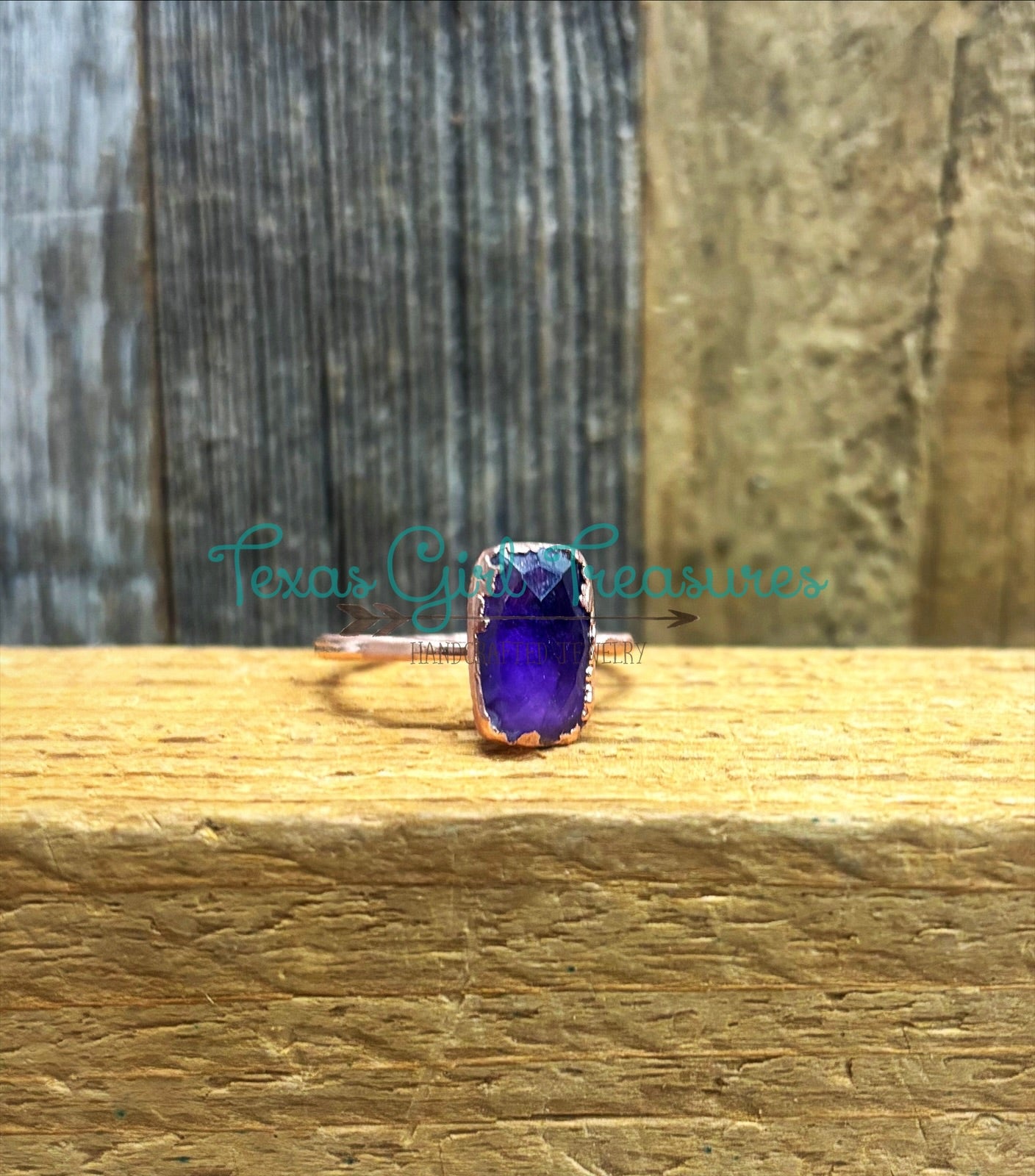 These Amethyst rings are made through a process of electroforming with pure copper. Electroforming gives the piece an organic, non-structured appearance. The ring has been double sealed with a protectant to keep the copper from patina or darkening.