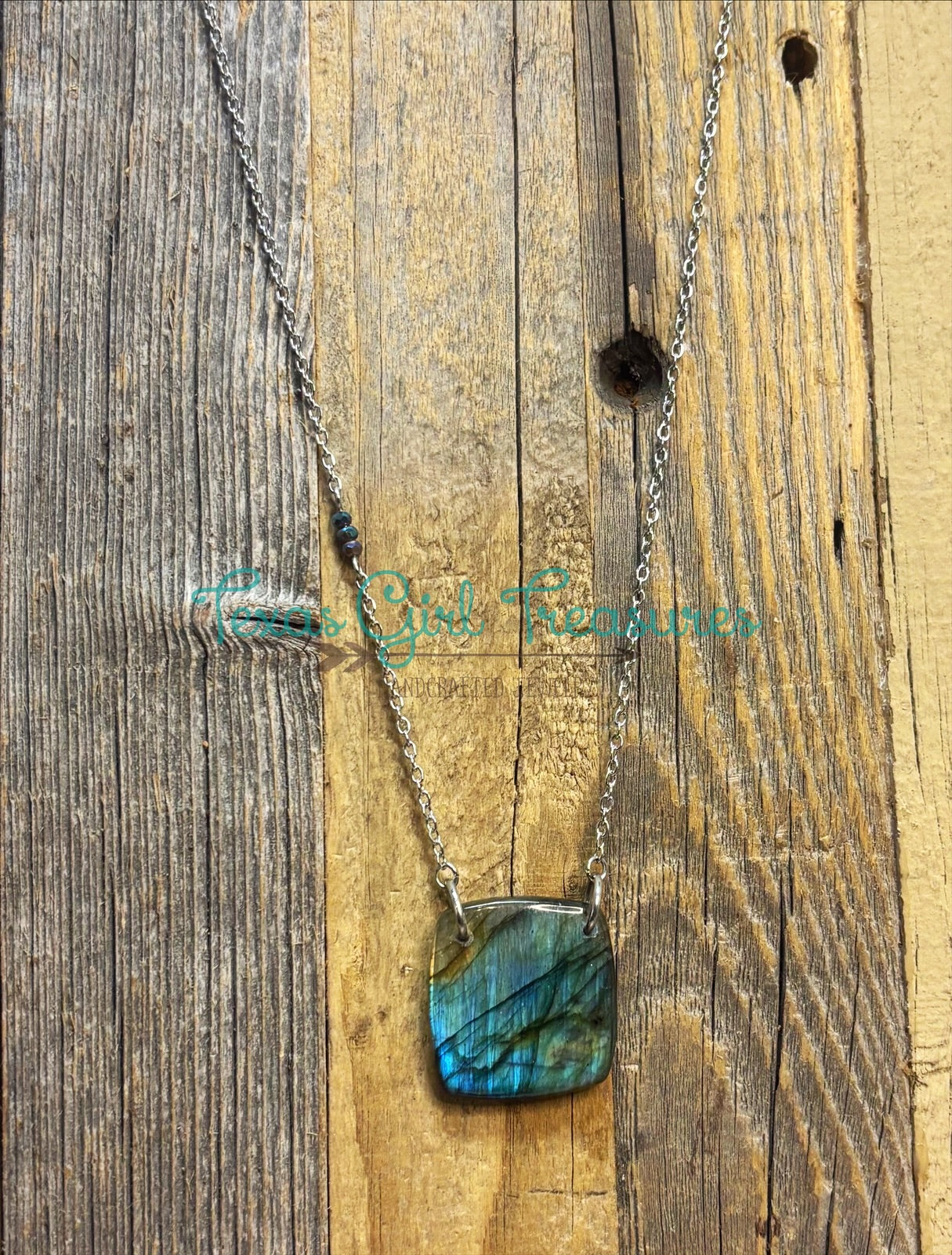Uniquely shaped Labradorite on an 18” chain with a 2”-3” extender on the back. Accent bead on chain.
