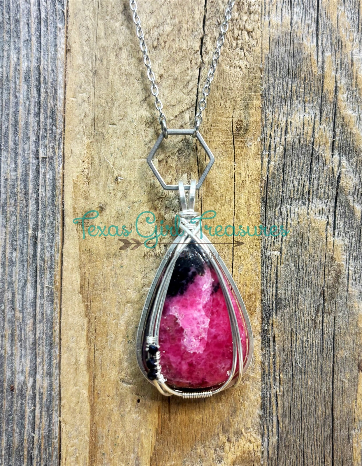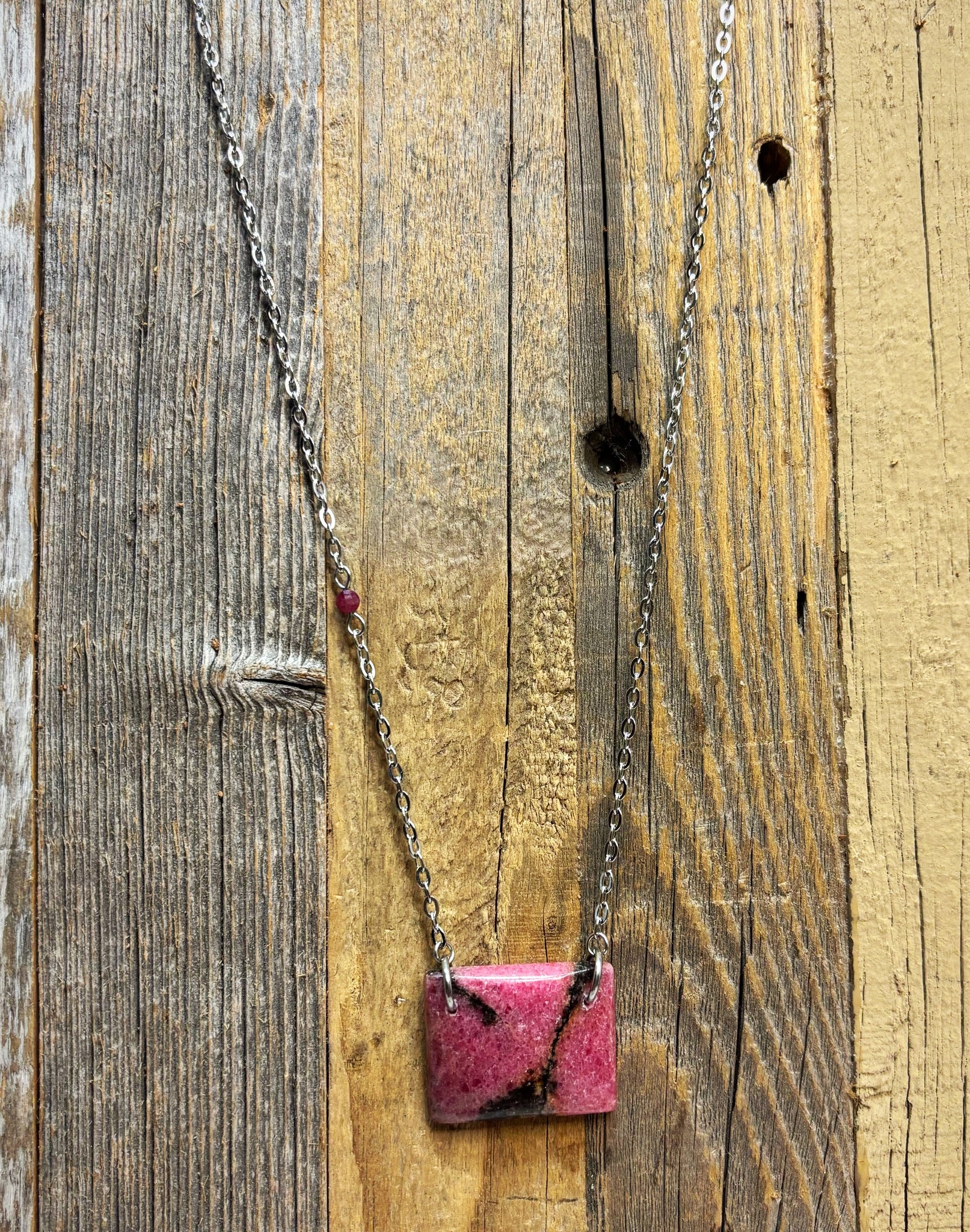 Gorgeous dark pink Rhodonite on an 18” chain with a 2”-3” extender on the back. Sterling Silver