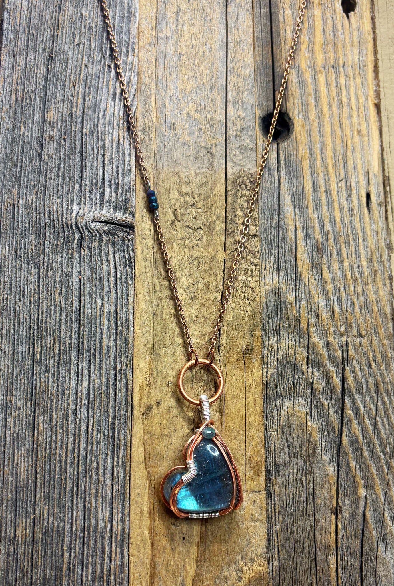 Uniquely Heart shaped Labradorite on an 18” chain with a 2”-3” extender on the back. Accent bead on chain.