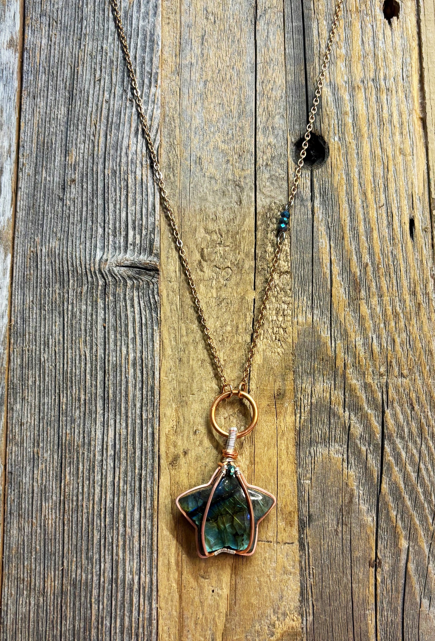 Uniquely Heart and Star shaped Labradorite on an 18” chain with a 2”-3” extender on the back. Accent bead on chain.